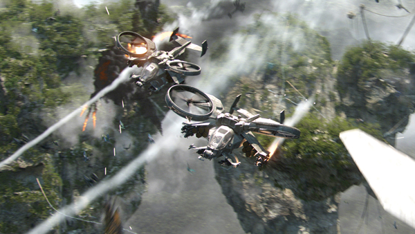 Monitors and HUDs Some vendors hired for VFX work used After Effects to create 3D stereo composites for finished shots, motion graphics for the 3D holographic screens in various control room scenes and heads-up displays for the vehicles in the film. Prime Focus designed displays for the Op Center's Holotable over which the film's main characters discuss their mining plans on Pandora. In one scene, Jake Sully and an officer invoke a three-dimensional hologram of the ‘Home Tree’, where the Na’vi people live. Using the original live-action plate of a table with a greenscreen across the top, Prime Focus modeled the hardware that went inside the table and the projector beams, and added graphics projected above the table of the terrain, including the Home Tree. These graphics were designed in 2D in Illustrator, animated in After Effects, placed on cards in 3D and rendered in 3ds Max. Prime Focus Software's Krakatoa particle system was used for the 3D terrain, which gave the images a scan-lined LIDAR-like quality. The team developed a custom graphics script called 'Screen Art Graphic Interface', binding After Effects renders to a 3ds Max assembly file. Pixel Liberation Front designed and animated the monitors and HUDs for the movie’s military aircraft. As reference, their team used recent military aircraft - the F22, F35 Joint strike fighters and Apache Attack helicopters - as a starting point and embellished their designs to fit the needs and dimensions of the aircraft in the film. Stephen Lawes, creative director at PLF, said, "Each aircraft had a specific design approach that uniquely identified that specific vehicle. The Valkyrie and Dragon were the most complicated and dense due to the curvature, size and quantity of the screens. The AMP suit HUD especially required a lot of attention as it drove a series of story points depicting the distance and size of the Direhorse and Hammerhead charges as an active infrared visual.” They designed the initial screens in Adobe Illustrator for all of these aircraft, and animated them in Adobe After Effects. For the rough composites, both Weta and ILM sent PLF tracking data that they used in AE to get approval from Cameron, and then delivered the final elements as .EXR files to both vendors. Most of the graphics didn't require their own stereo space, so mono elements were delivered. However, when a couple of close ups did require stereographics, they spatially arranged the graphics in AE's 3D space with two virtual cameras that were derived from the 3D track of the plates.