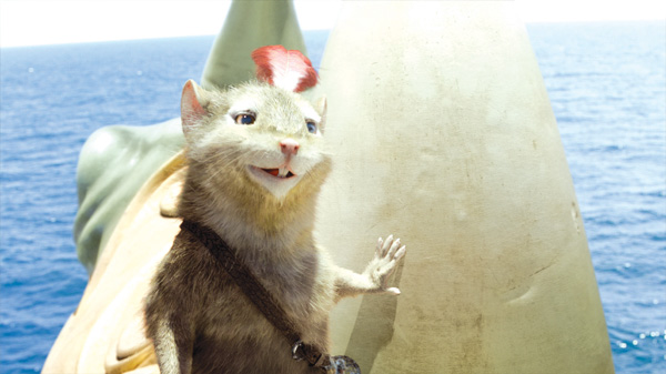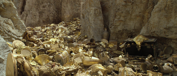 Starting with a clean frame of the background, Coriakin was re-modelled to match his contours and the clean frame was projected onto a 3D version of him. Richard explained, "If the camera had been standing still, you would have seen nothing, but as it travels forward, the model no longer perspective-shifts in the way that your eyes expect. You notice an odd change as the background peels forward, which the artists enhanced by modelling refractive glass and other textures into the Coriakin model. As you get closer still to him, those details become more obvious, changing into a defined shape."