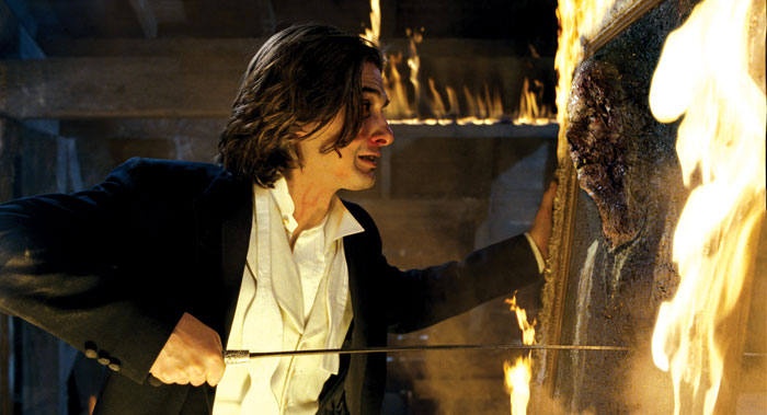 Breakdown: Elements and Light “First we broke the image down to its key elements - animation, surface texture, surface animation, transition and the form. We wanted the paint itself to have a thick and tangible quality, and the original painting's artist Paul Benny worked with us to come up with natural paint looks that were a realistic departure from the original art.” They broke up all the lighting elements, too, and each light was rendered separately. The three cameras gave coverage for moving shots, used for accurate tracking and 3D rotoing as well as texture projection. “Moving frames of Ben Barnes and the original painting were camera projected onto the geometry we created for the erupting painting. These projections were rendered and baked into the new painting animations. Henry Badgett, the lead compositor, then combined all these elements with the help of some proprietary compositing projection tools using Shake.” In the frightening climactic scene when Dorian stretches through the canvas transitioning from 2D picture to 3D image, the main problem was balancing the lighting from the picture with that of the room while retaining the picture’s original colours and textures and blending this with the live action room. Lead lighting artist Jensen Toms needed to experiment with the surface lighting. “We had to depart from the usual ‘match the set’ lighting rule and work with light that gave distinct shadows to visualise the 3D form of the moving surface,” said Charley. “Then in Shake, Henry very carefully balanced the 3D set lighting, fire light and the values of the painting itself. Flames and smoke were composited from a separate live action practical shoot we did.”