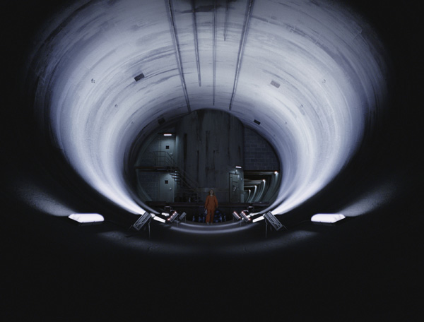 The Windkanal had the right looks for the story but lacked the necessary holding cells, which were built on a set at the Berlin film studio at Babelsberg. Joe also wanted to convey the drama of Hanna’s escape by giving her a long perilous run toward a massive steel door that she just manages to slide under before it falls shut. The Art Department had built a significant set at the location to try to accommodate this, but it wasn’t going to produce the look Joe wanted. To build further would have been too costly so, initially, Mr X were going to extend the set walls but eventually built a complete cg tunnel, including the steel door.
