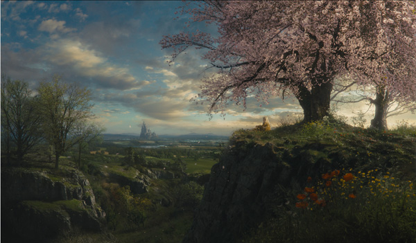 “While we had a map for the environment and for the world that Maleficent inhabited, the whole scene didn’t live together in one file. Each location was its own build. Many times when you look from fairy world to castle, or from castle to fairy world, we established a rough visual distance for how far apart the worlds are. But we then adjusted it as needed for good shot composition, and for storytelling purposes. So sometimes in a night scene, we might bring the silhouetted castle on the horizon a bit closer to seem more imposing than it might feel at its regular distance away. “The final shots were almost always a combination, based a matte painting split up into multiple levels and either placed on cards in a 2.5 D system or projected onto 3D geometry. On top of that, we added 3D elements all around to help with parallax and add life to areas of the frame that were too static. In this way, despite working on a stereo show, our use of matte paintings wasn’t necessarily limited, since we paid a lot of attention to how we implemented those matte paintings and how we dressed the environment around the painted elements.” |
