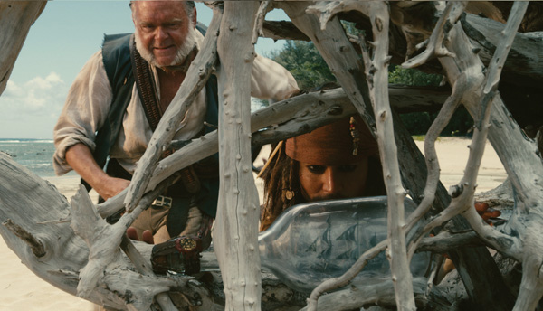The team at Cinesite opens ‘Pirates of the Caribbean: On Stranger Tides’ with a thrilling chase through the streets of old London, led by VFX Supervisor Simon Stanley-Clamp. At ILM Singapore, VFX Supervisor Mohen Leo’s team gave Blackbeard his ability to capture pirate ships in bottles, trapped forever on the open seas.