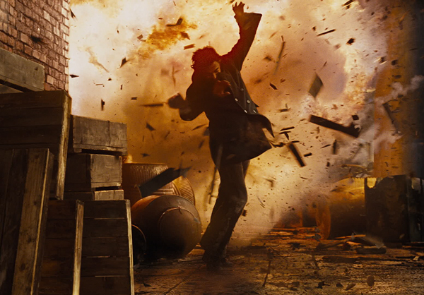 Emotive Explosions Several shots needed 3D fire of course, using Maya Fluids, particularly when Holmes is trapped inside a fireball shielding himself with a flaming crate. Abundant 2D elements for flying and falling debris were also created. “This debris was critical in helping a viewer follow the explosions’ motion. Guy wanted you to lock onto an individual piece of debris and follow it slowly spinning toward you or past the camera. The soundtrack helped, dropping to a muffled roar, and the extreme slow motion gave a balletic feel to the movement. Each shot in our sequence had to have bits flying past worth following, to elicit an emotional response to the movement. Only careful use of animation could do this.” Jonathan is happy with the sequence now although they’d had to keep at it through the last day of production. “Guy had been fairly willing to concede to reality in the shipyard sequence, but the wharf explosions were different. He always wanted to see more drama going on, more bits of debris. ‘There’s a blank space there. I need something in it.’ He understood his own mind, though, and knew he was asking for something fantastical but he wanted a visual, visceral representation. Both he and the actors really enjoyed it, and that whole attitude of fun crept into post as well. “I could have used another three months to really get the sequence right. FX work is like that, the first 90 per cent goes smoothly but the last 10 per cent takes forever. Some directors get impatient or bored but Guy wasn’t afraid to work through it.”