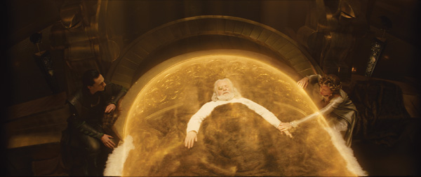 A further challenge was the need for the actors to hold dialogue across Odin’s bed, and a beam would have interfered with their performances. Instead, a dome-like field of energy was explored as an alternative. They considered a surface like the sun’s would also be effective – fluid, burning and gaseous. Their energy field, developed by CG Supervisor Pawel Olas, incorporated bubbling particles, allowing it a feeling of depth when seen in stereo. It was achieved through a series of particle simulations with fluid properties in shimmering gold colours, filling up the space around him. The helios effects were small fluid simulations to give it a natural organic quality of energy, similar to the concept of the Bi-frost.